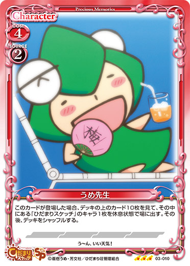 | このカードが登場した場合、デッキの上のカード10枚を見て、その中にある『ひだまりスケッチ』のキャラ1枚を休息状態で場に出す。その後、デッキをシャッフルする。 | ||