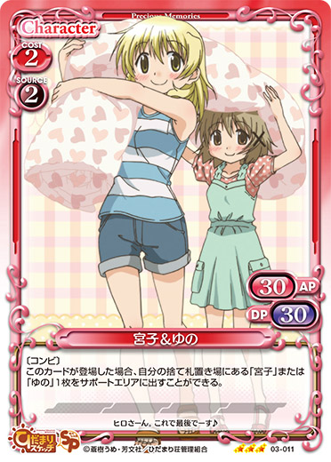 | 〔コンビ〕 このカードが登場した場合、自分の捨て札置き場にある「宮子」または「ゆの」1枚をサポートエリアに出すことができる。 | ||
