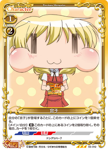 | 自分の「宮子」が登場するごとに、このカードの上にコインを1個乗せる。 [メイン/自分]:《0》このカードの上にあるコインを2個取り除く。その場合、カードを1枚引く。 | ||