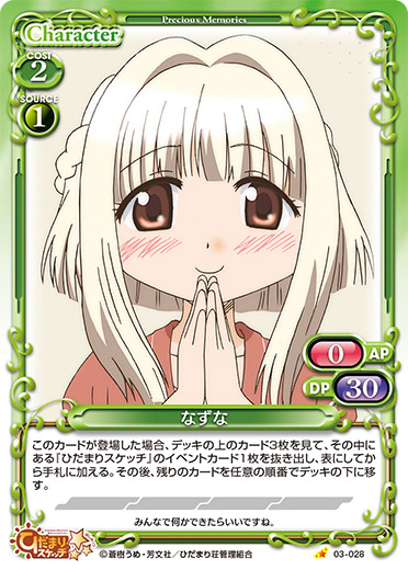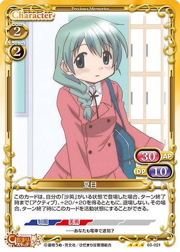| このカードが登場した場合、自分のポイント置き場にある『ひだまりスケッチ』のカードを2枚まで表向きにすることができる。 | ||