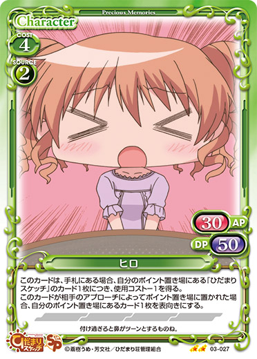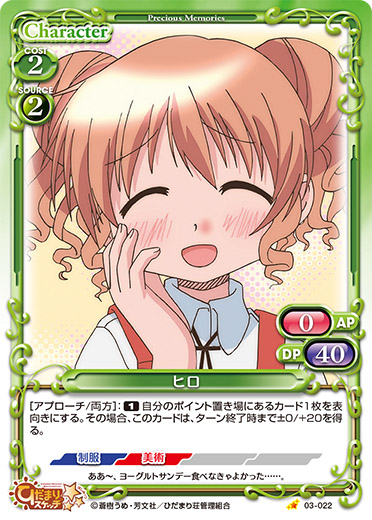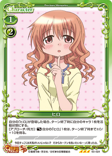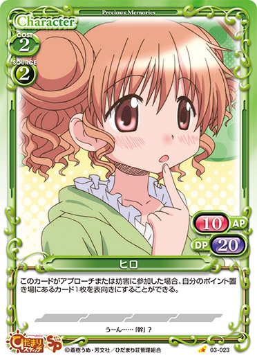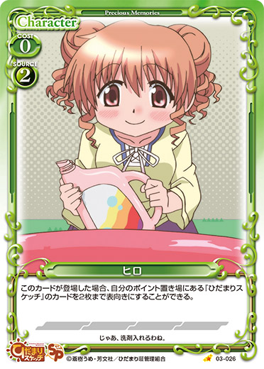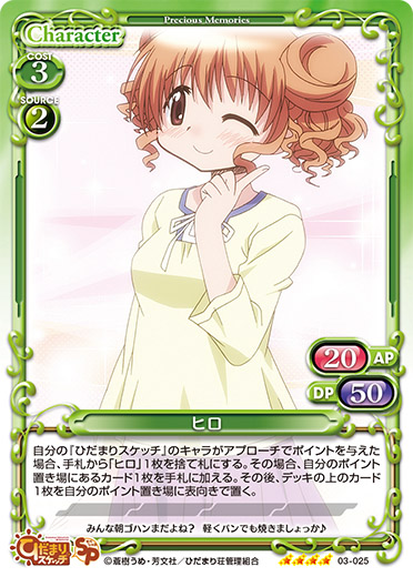 | 自分の『ひだまりスケッチ』のキャラがアプローチでポイントを与えた場合、手札から「ヒロ」1枚を捨て札にする。その場合、自分のポイント置き場にあるカード1枚を手札に加える。その後、デッキの上のカード1枚を自分のポイント置き場に表向きで置く。 | ||