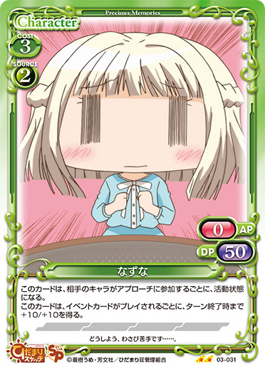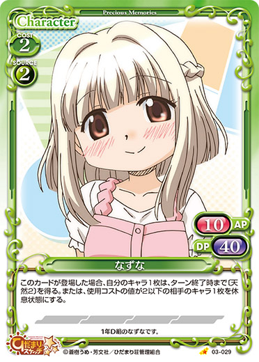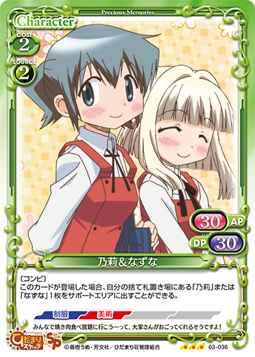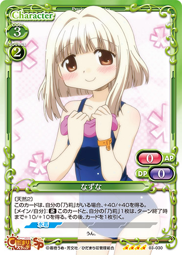 | 〔コンビ〕 このカードが登場した場合、自分の捨て札置き場にある「乃莉」または「なずな」1枚をサポートエリアに出すことができる。 | ||