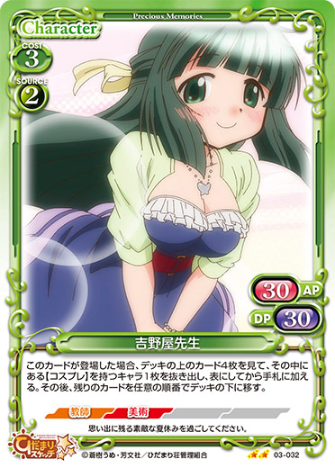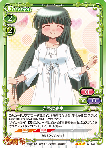 | このカードがアプローチでポイントを与えた場合、手札から【コスプレ】を持つキャラ1枚を場に出すことができる。 [メイン/自分]:《0》このカードは、自分の「吉野屋先生」と【コスプレ】を持つキャラ1枚につき、+10/+10を得る。 | ||
