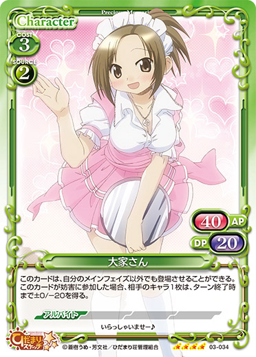 | 自分の『ひだまりスケッチ』のキャラがアプローチでポイントを与えた場合、このカードをデッキの下に移す。その場合、カードを1枚引く。その後、自分のポイント置き場にあるカード1枚を表向きにすることができる。 | ||