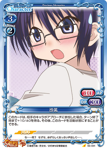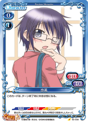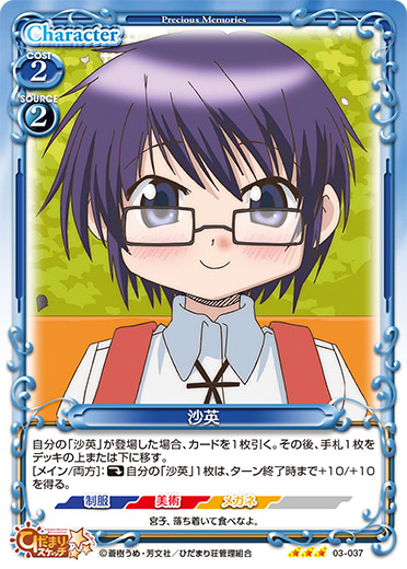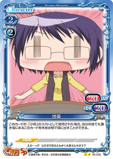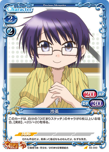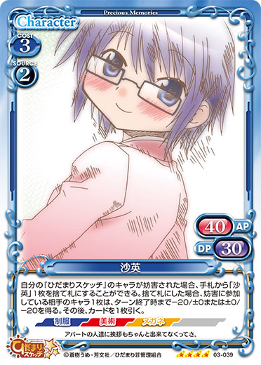 | 自分の『ひだまりスケッチ』のキャラが妨害された場合、手札から「沙英」1枚を捨て札にすることができる。捨て札にした場合、妨害に参加している相手のキャラ1枚は、ターン終了時まで-20/±0または±0/-20を得る。その後、カードを1枚引く。 | ||