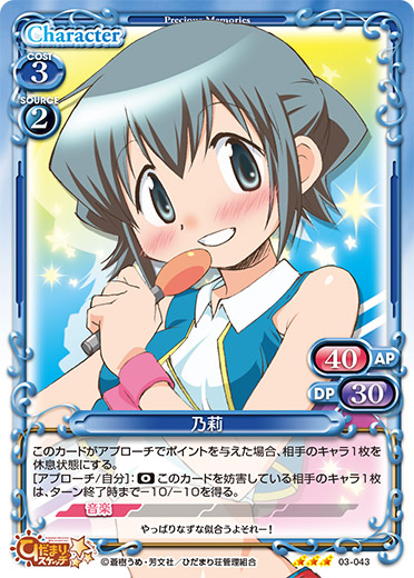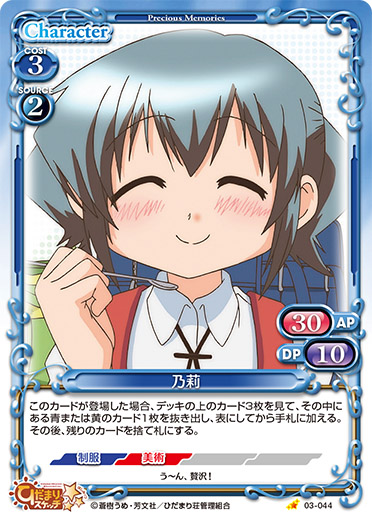 | 自分の「沙英」が登場した場合、カードを1枚引く。その後、手札1枚をデッキの上または下に移す。 [メイン/両方]:《休》自分の「沙英」1枚は、ターン終了時まで+10/+10を得る。 | ||