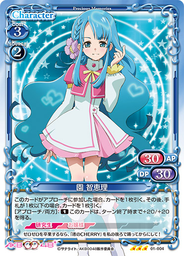 | [メイン/自分]:《0》自分の「園 智恵理」1枚を指定する。このターン、指定したキャラがアプローチでポイントを与えた場合、カードを2枚引く。 | ||