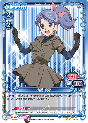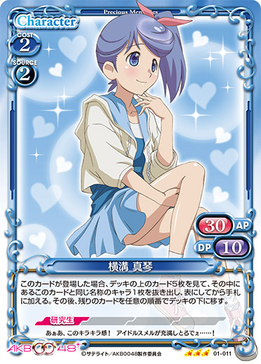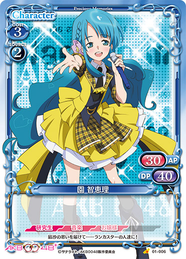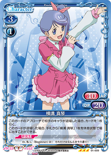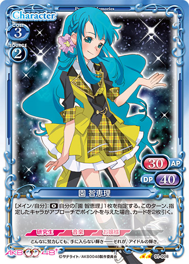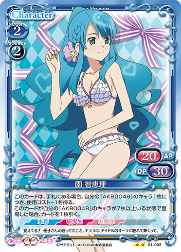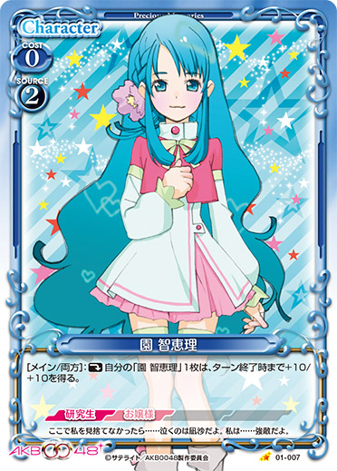 | このカードは、手札にある場合、自分の『AKB0048』のキャラ1枚につき、使用コスト-1を得る。このカードが自分の『AKB0048』のキャラが7枚以上いる状態で登場した場合、カードを1枚引く。 | ||