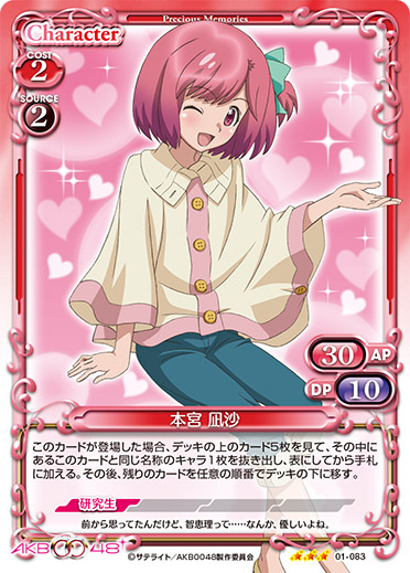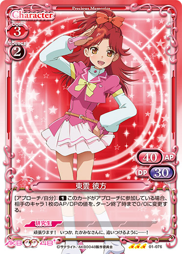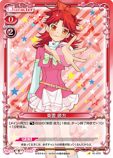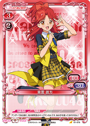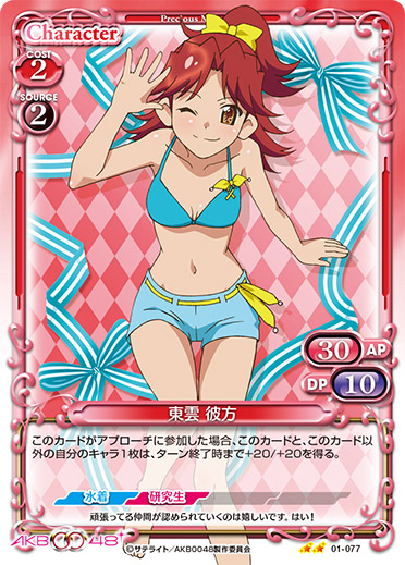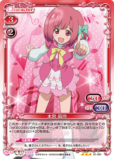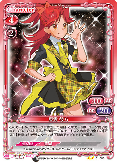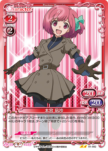| このカードがアプローチまたは妨害に参加した場合、自分の『AKB0048』のキャラ1枚は、ターン終了時まで+20/+20を得る。 | ||