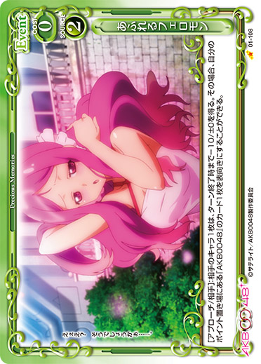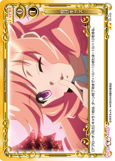 | [アプローチ/相手]:相手のキャラ1枚は、ターン終了時まで-10/±0を得る。その場合、自分のポイント置き場にある『AKB0048』のカード1枚を表向きにすることができる。 | ||