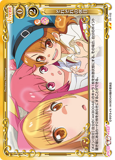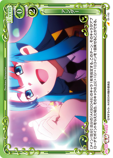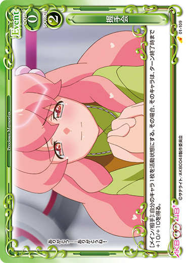 | [メイン/自分]:自分の『AKB0048』のキャラ1枚を休息状態にする。その場合、自分のポイント置き場にあるカード2枚を表向きにすることができる。 | ||