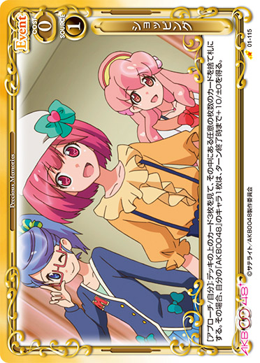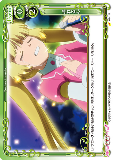 | [アプローチ/自分]:デッキの上のカード3枚を見て、その中にある任意の枚数のカードを捨て札にする。その場合、自分の『AKB0048』のキャラ1枚は、ターン終了時まで+10/±0を得る。 | ||