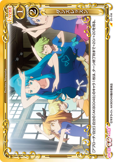 | [アプローチ/自分]:自分の『AKB0048』のキャラ1枚は、ターン終了時まで+20/+20を得る。 | ||