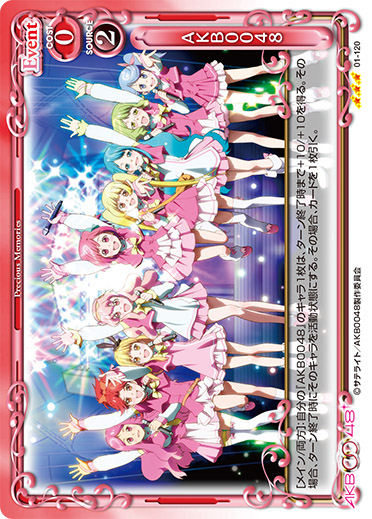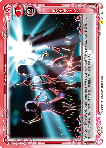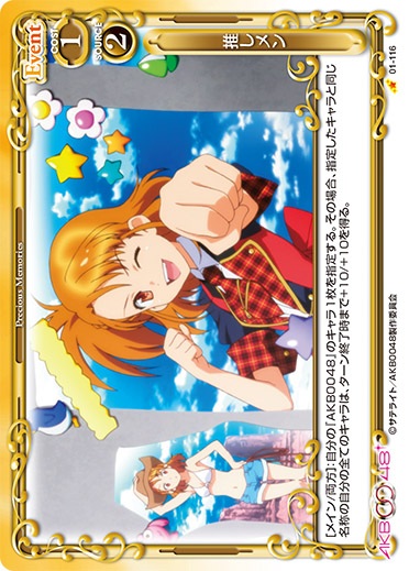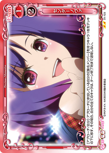 | [メイン/自分]:自分の『AKB0048』のキャラ1枚は、ターン終了時まで+30/+30を得る。このターン、そのキャラがアプローチに参加した場合、カードを1枚引く。 | ||