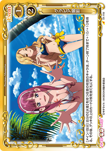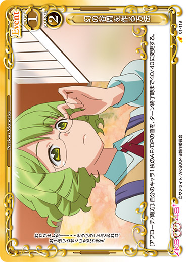 | [メイン/両方]:自分の『AKB0048』のキャラ1枚は、ターン終了時まで+10/+10を得る。その場合、ターン終了時にそのキャラを活動状態にする。その場合、カードを1枚引く。 | ||