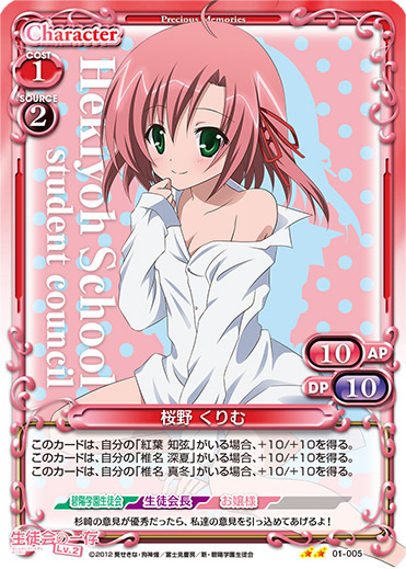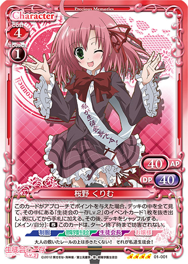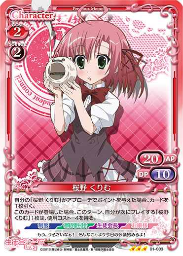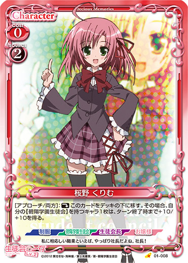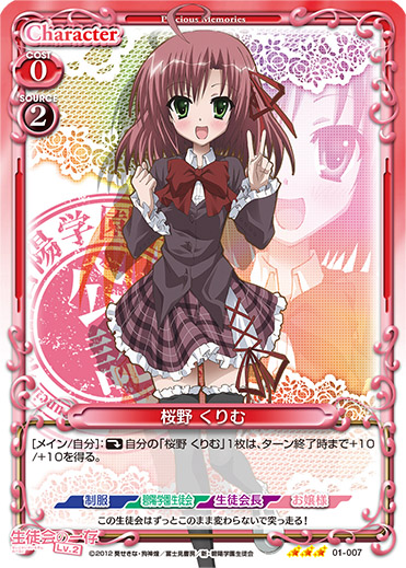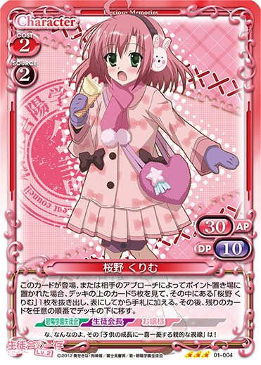 | 自分の「桜野 くりむ」がアプローチでポイントを与えた場合、カードを1枚引く。このカードが登場した場合、このターン、自分が次にプレイする「桜野 くりむ」1枚は、使用コスト-4を得る。 | ||