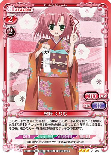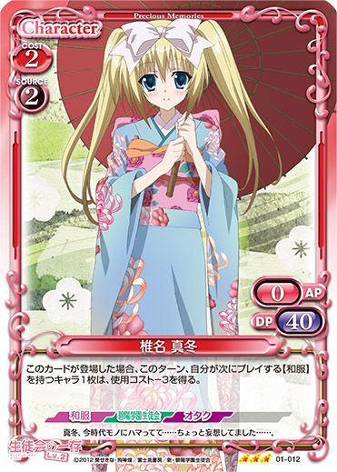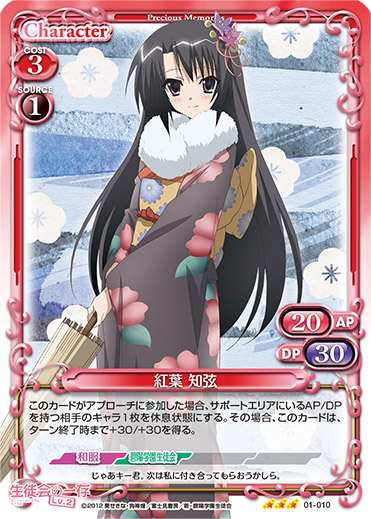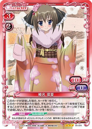 | このカードが登場した場合、このターン、自分が次にプレイする【和服】を持つキャラ1枚は、使用コスト-3を得る。 | ||