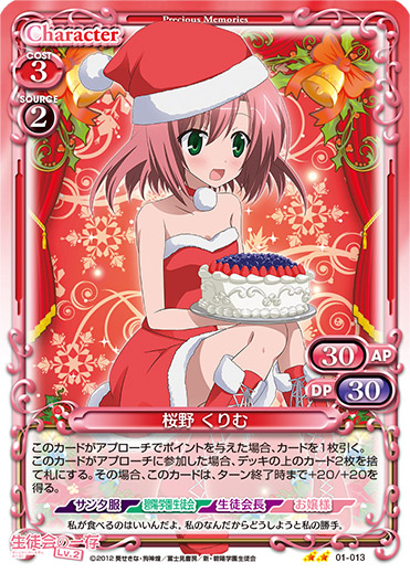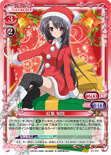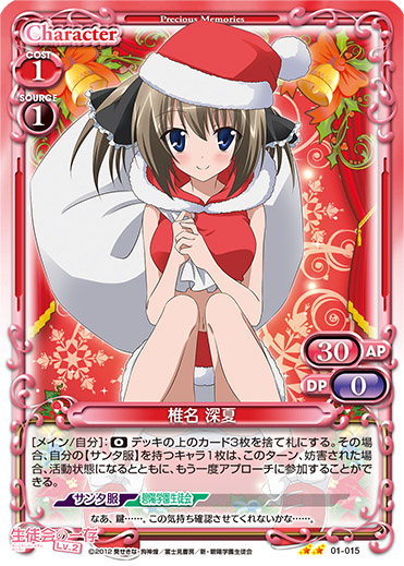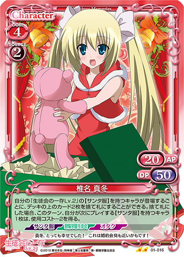 | 自分の『生徒会の一存LV.2』の【サンタ服】を持つキャラが登場するごとに、デッキの上のカード2枚を捨て札にすることができる。捨て札にした場合、このターン、自分が次にプレイする【サンタ服】を持つキャラ1枚は、使用コスト-2を得る。 | ||