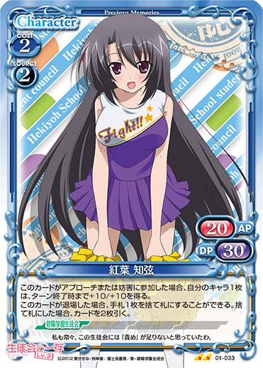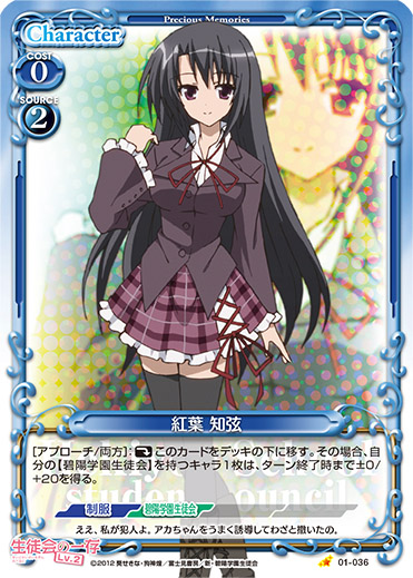 | [アプローチ/両方]:《休》このカードをデッキの下に移す。その場合、自分の【碧陽学園生徒会】を持つキャラ1枚は、ターン終了時まで±0/+20を得る。 | ||
