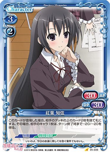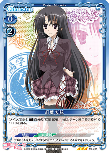 | [メイン/自分]:《休》自分の「紅葉 知弦」1枚は、ターン終了時まで+10/+10を得る。 | ||