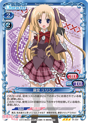 | このカードは、使用コストの値が2以下のキャラに妨害されている場合、退場しない。このカードは、使用コストの値が2以下のキャラを妨害している場合、退場しない。 | ||
