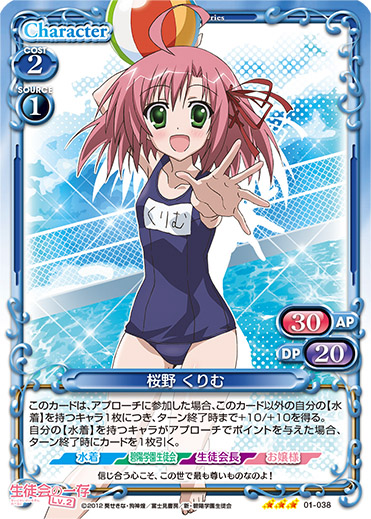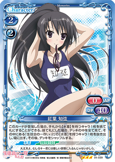 | このカードが登場した場合、手札から【水着】を持つキャラ1枚を捨て札にすることができる。捨て札にした場合、デッキの中を全て見て、その中にある『生徒会の一存LV.2』の【水着】を持つキャラ1枚を抜き出し、場に出す。その後、デッキをシャッフルする。 | ||