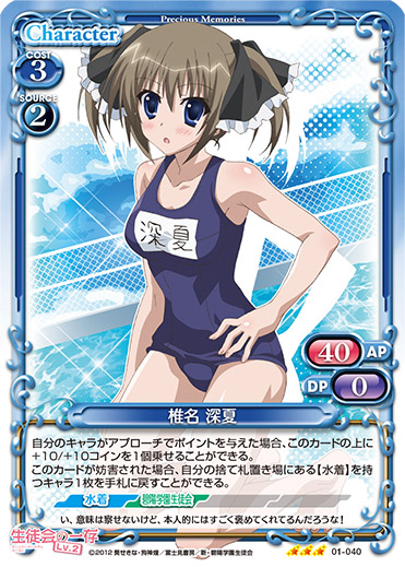 | 自分のキャラがアプローチでポイントを与えた場合、このカードの上に+10/+10コインを1個乗せることができる。このカードが妨害された場合、自分の捨て札置き場にある【水着】を持つキャラ1枚を手札に戻すことができる。 | ||