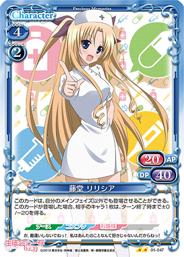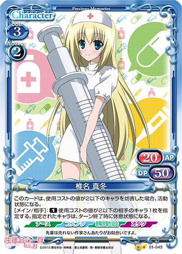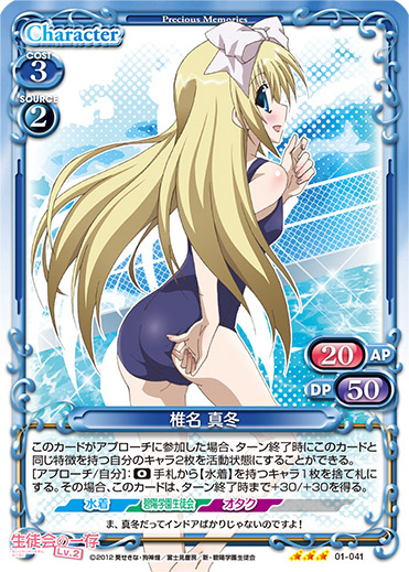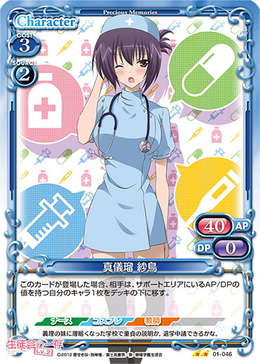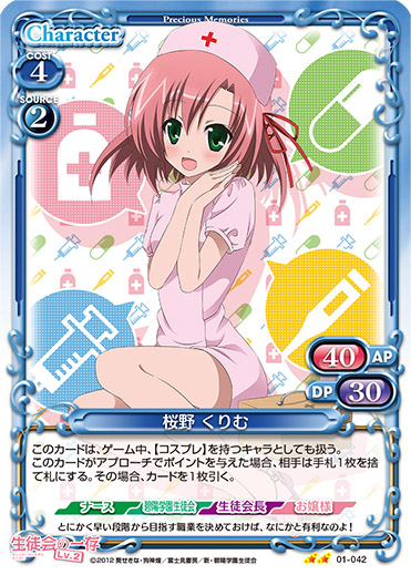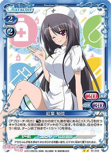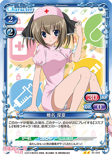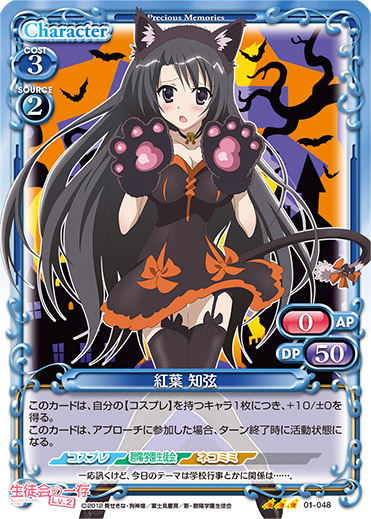 | このカードは、ゲーム中、【コスプレ】を持つキャラとしても扱う。このカードがアプローチでポイントを与えた場合、相手は手札1枚を捨て札にする。その場合、カードを1枚引く。 | ||
