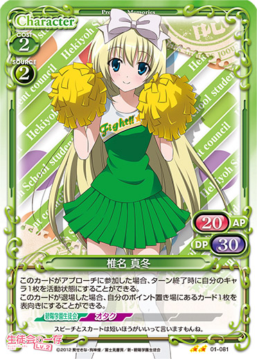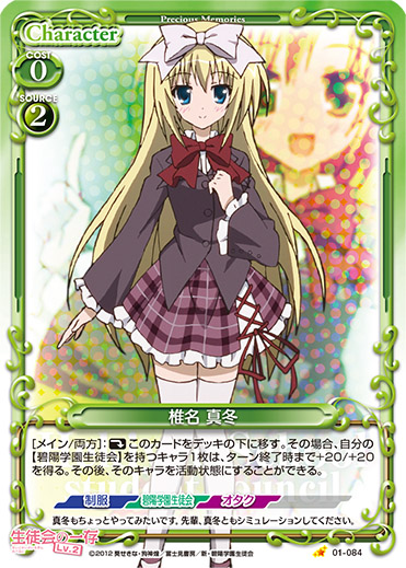 | [メイン/両方]:《休》このカードをデッキの下に移す。その場合、自分の【碧陽学園生徒会】を持つキャラ1枚は、ターン終了時まで+20/+20を得る。その後、そのキャラを活動状態にすることができる。 | ||