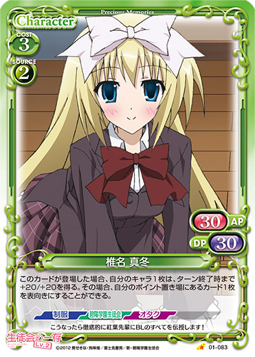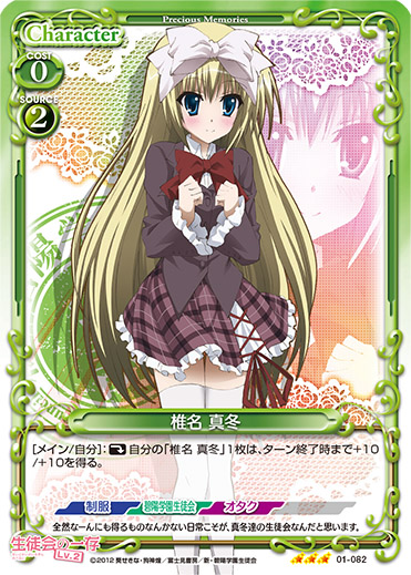 | [メイン/自分]:《休》自分の「椎名 真冬」1枚は、ターン終了時まで+10/+10を得る。 | ||