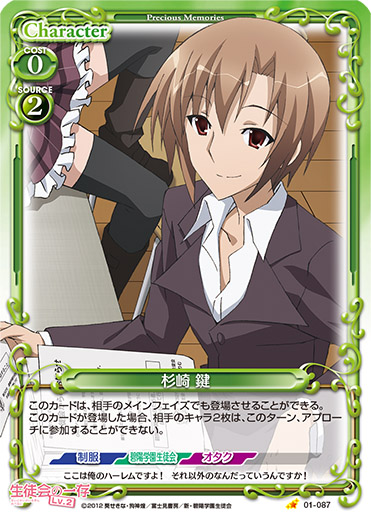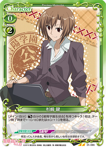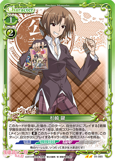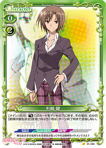| [メイン/自分]:《休》このカードをデッキの下に移す。その場合、自分の【碧陽学園生徒会】を持つキャラ1枚は、ターン終了時まで退場しない。 | ||