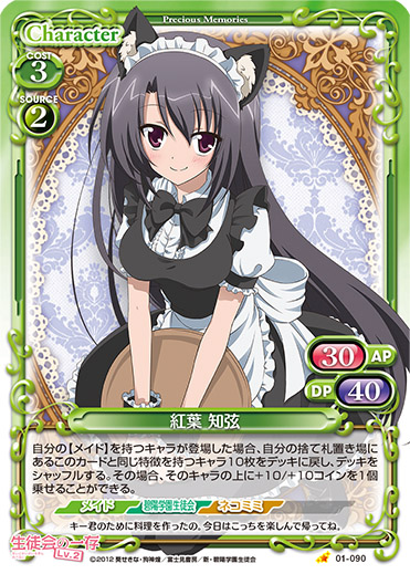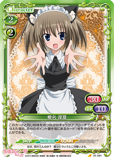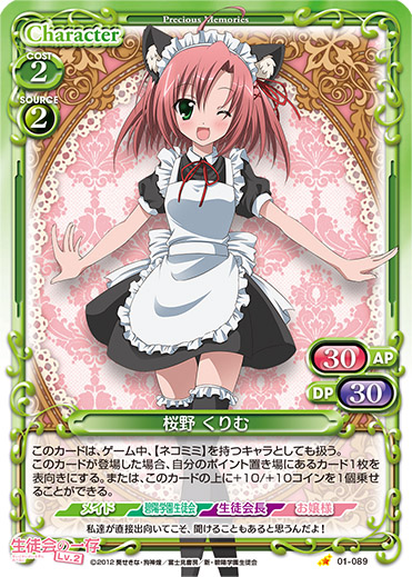 | このカードは、ゲーム中、【ネコミミ】を持つキャラとしても扱う。このカードが登場した場合、自分のポイント置き場にあるカード1枚を表向きにする。または、このカードの上に+10/+10コインを1個乗せることができる。 | ||