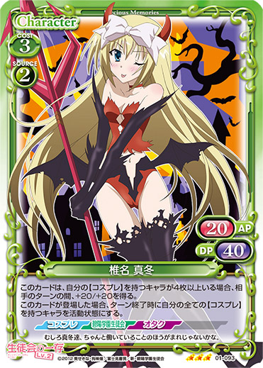 | このカードは、自分の【コスプレ】を持つキャラが4枚以上いる場合、相手のターンの間、+20/+20を得る。このカードが登場した場合、ターン終了時に自分の全ての【コスプレ】を持つキャラを活動状態にする。 | ||