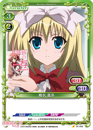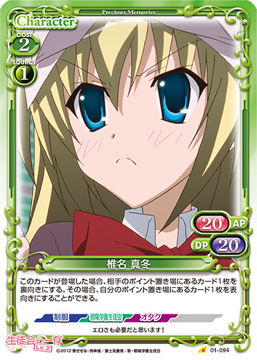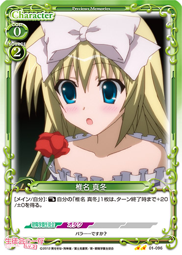 | [メイン/自分]:《休》自分の「椎名 真冬」1枚は、ターン終了時まで+20/±0を得る。 | ||