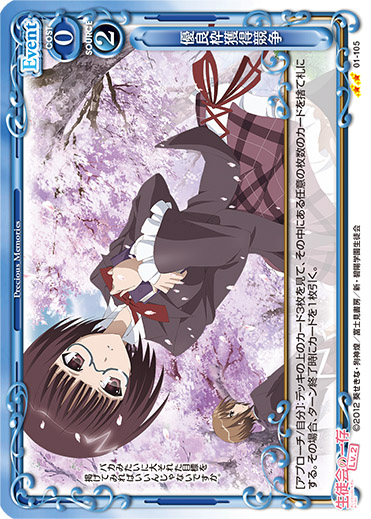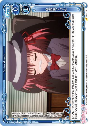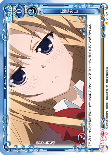 | [アプローチ/両方]:自分の「紅葉 知弦」1枚は、ターン終了時まで+10/+10を得る。このターン、そのキャラのアプローチで相手のキャラが退場した場合、カードを2枚引く。 | ||