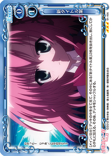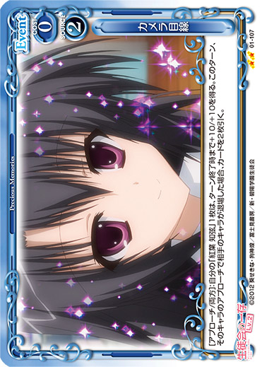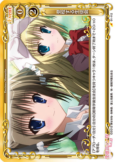 | [アプローチ/自分]:自分の【碧陽学園生徒会】を持つキャラ1枚は、ターン終了時まで+20/±0を得る。 | ||