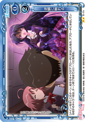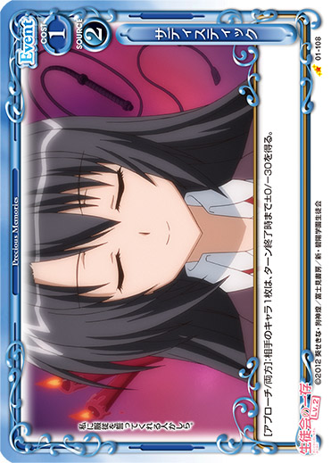 | [メイン/相手]:このターン、相手のキャラがアプローチに参加した場合、アプローチに参加している相手のキャラ1枚は、ターン終了時まで±0/-100を得る。 | ||