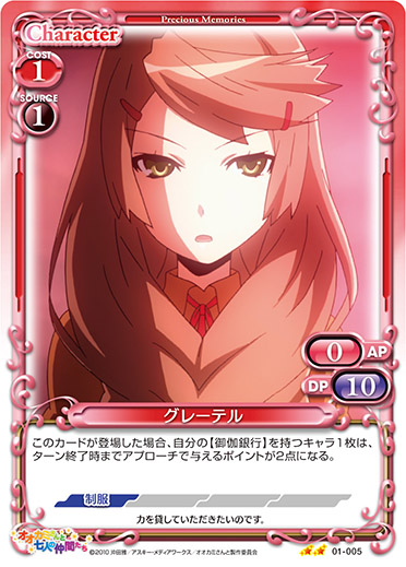 | このカードが登場した場合、自分の【御伽銀行】を持つキャラ1枚は、ターン終了時まで、アプローチで与えるポイントが2点になる。 | ||