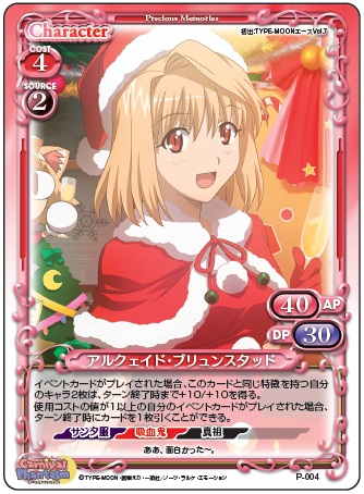 | イベントカードがプレイされた場合、このカードと同じ特徴を持つ自分のキャラ2枚は、ターン終了時まで+10/+10を得る。 使用コストの値が1以上の自分のイベントカードがプレイされた場合、ターン終了時にカードを1枚引くことができる。 | ||