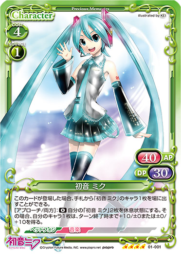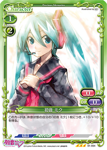 | このカードが登場した場合、このターン、自分が次にプレイする『初音 ミク』のキャラ1枚は、使用コスト-3を得る。 | ||