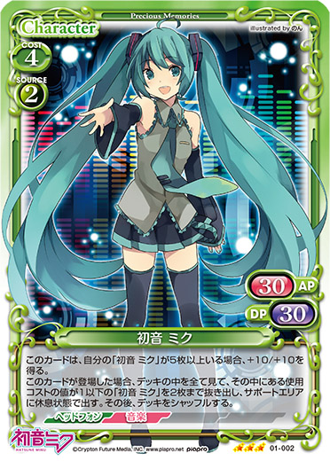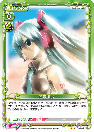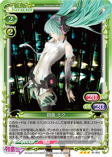 | このカードは、「初音 ミク」のコストに使用する場合、発生コスト+2を得る。このカードが登場した場合、デッキの上のカード5枚を見て、その中にある『初音 ミク』のイベントカード1枚を抜き出し、表にしてから手札に加える。その後、残りのカードを任意の順番でデッキの下に移す。 | ||