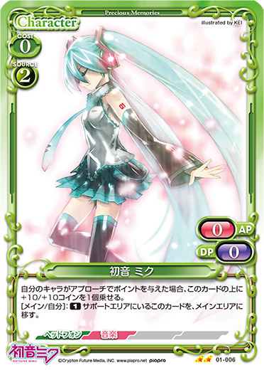 | [アプローチ/自分]:《0》このターン、自分の『初音 ミク』のキャラがアプローチでポイントを与えている場合、このカードをデッキの下に移す。その場合、カードを2枚引く。 | ||