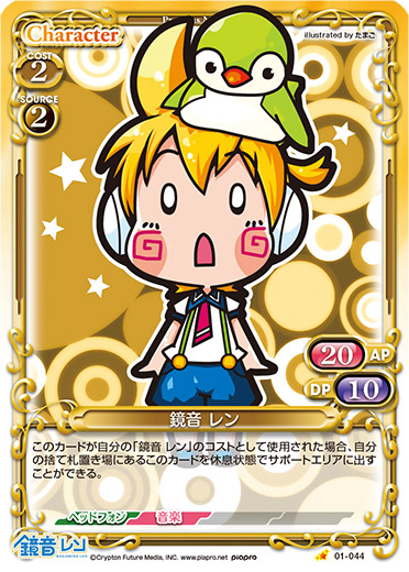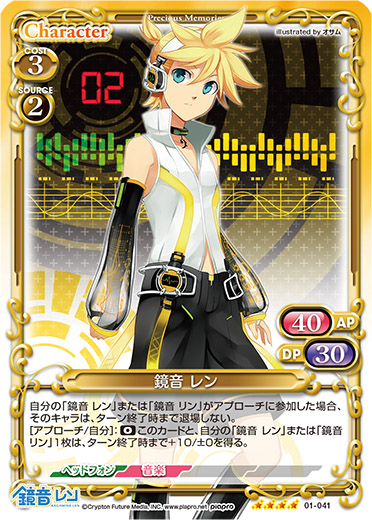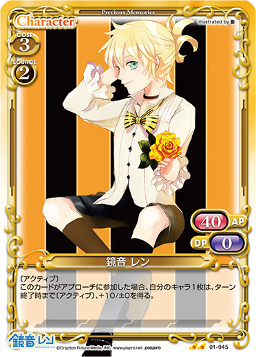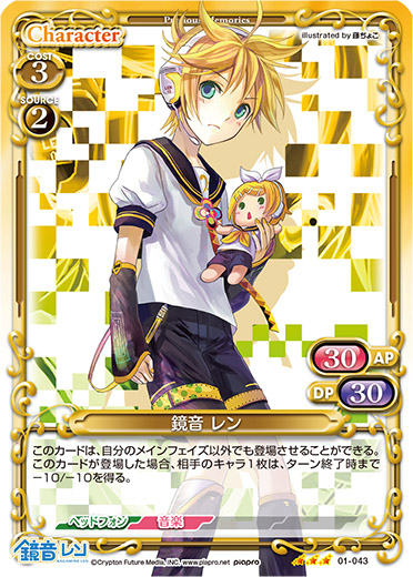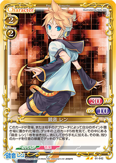 | 自分の「鏡音 レン」または「鏡音 リン」がアプローチでポイントを与えるごとに、相手のポイント置き場にあるカード1枚を裏向きにする。このカードが登場した場合、このターン、自分が次にプレイする「鏡音 レン」または「鏡音 リン」1枚は、使用コスト-3を得る。 | ||