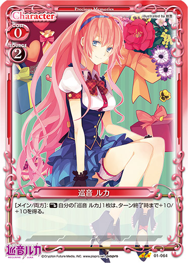 | [メイン/両方]:《休》自分の「巡音 ルカ」1枚は、ターン終了時まで+10/+10を得る。 | ||