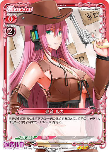 | 自分の「巡音 ルカ」がアプローチに参加するごとに、相手のキャラ1枚は、ターン終了時まで-10/-10を得る。 | ||