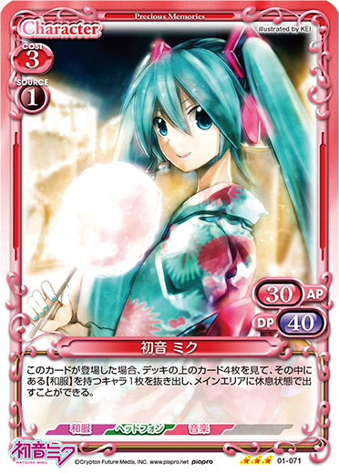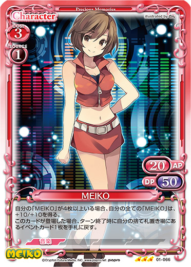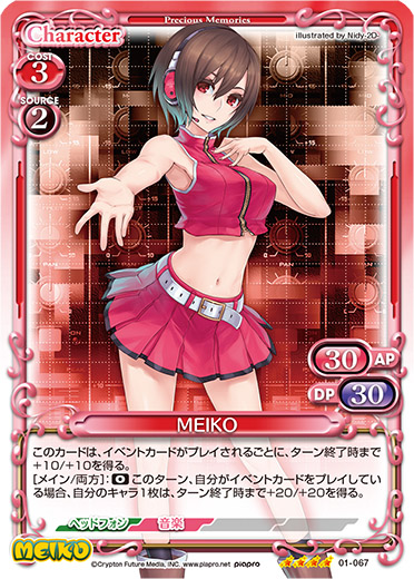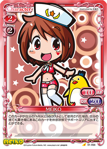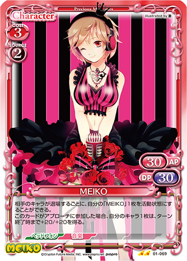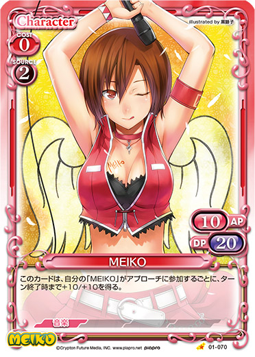 | 相手のキャラが退場するごとに、自分の「MEIKO」1枚を活動状態にすることができる。このカードがアプローチに参加した場合、自分のキャラ1枚は、ターン終了時まで+20/+20を得る。 | ||