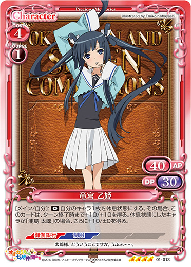| [メイン/自分]:《0》自分のキャラ1枚を休息状態にする。その場合、このカードは、ターン終了時まで+10/+10を得る。休息状態にしたキャラが「浦島 太郎」の場合、さらに+10/±0を得る。 | ||