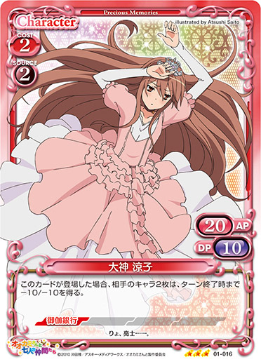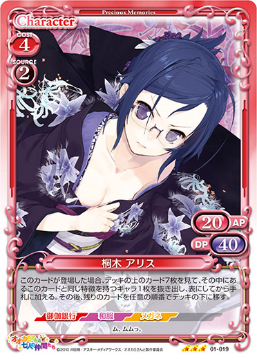 | このカードが登場した場合、デッキの上のカード7枚を見て、その中にあるこのカードと同じ特徴を持つキャラ1枚を抜き出し、表にしてから手札に加える。その後、残りのカードを任意の順番でデッキの下に移す。 | ||