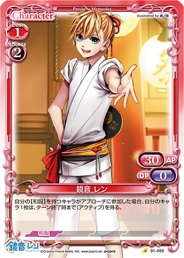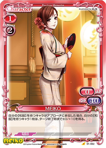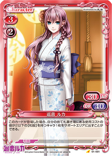 | 自分の【和服】を持つキャラがアプローチに参加した場合、自分の【和服】を持つキャラ1枚は、ターン終了時まで±0/+10を得る。 | ||