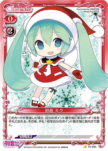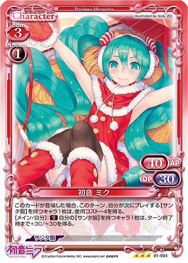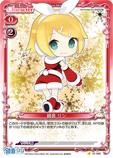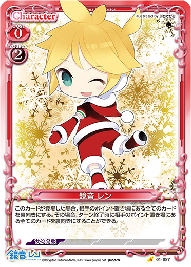 | このカードが登場した場合、このターン、自分が次にプレイする【サンタ服】を持つキャラ1枚は、使用コスト-4を得る。[メイン/自分]:《赤1》自分の【サンタ服】を持つキャラ1枚は、ターン終了時まで+30/+30を得る。 | ||